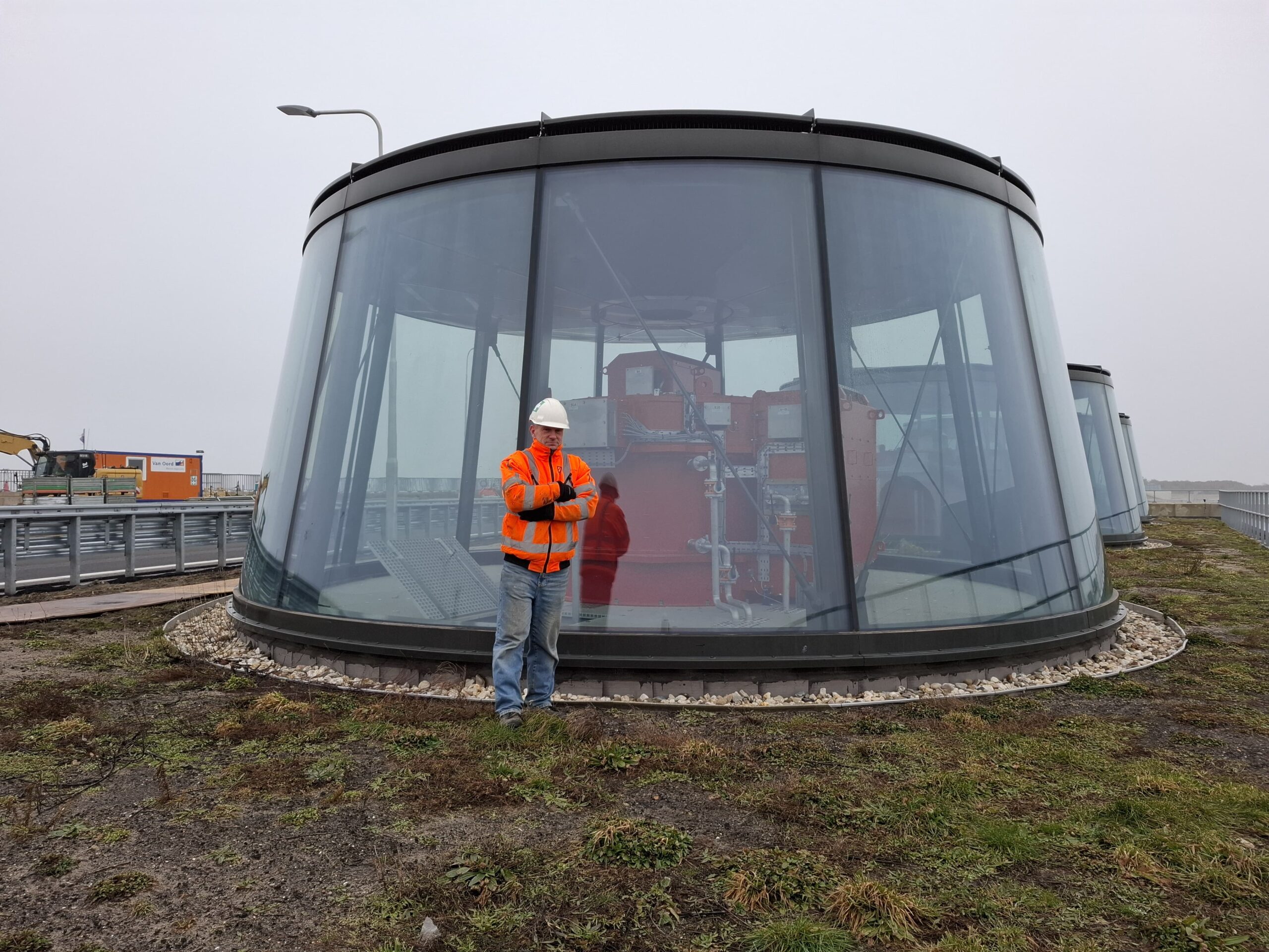 Zijn takenpakket is breed: hij werkte onder meer mee aan de bouw van de nieuwe pompen, spuisluizen en bijbehorende ondergrondse betonconstructies bij Den Oever. “De glazen koepels (zie foto, red.) zijn de pompen. Daaronder hadden we een kuip van 17 meter diep gerealiseerd. Onder de weg zijn grote watergangen aangelegd waar de pompen het water doorheen afvoeren. Aan alle kanten zit een enorme constructie onder de grond van tienduizenden kubieke meters beton.”